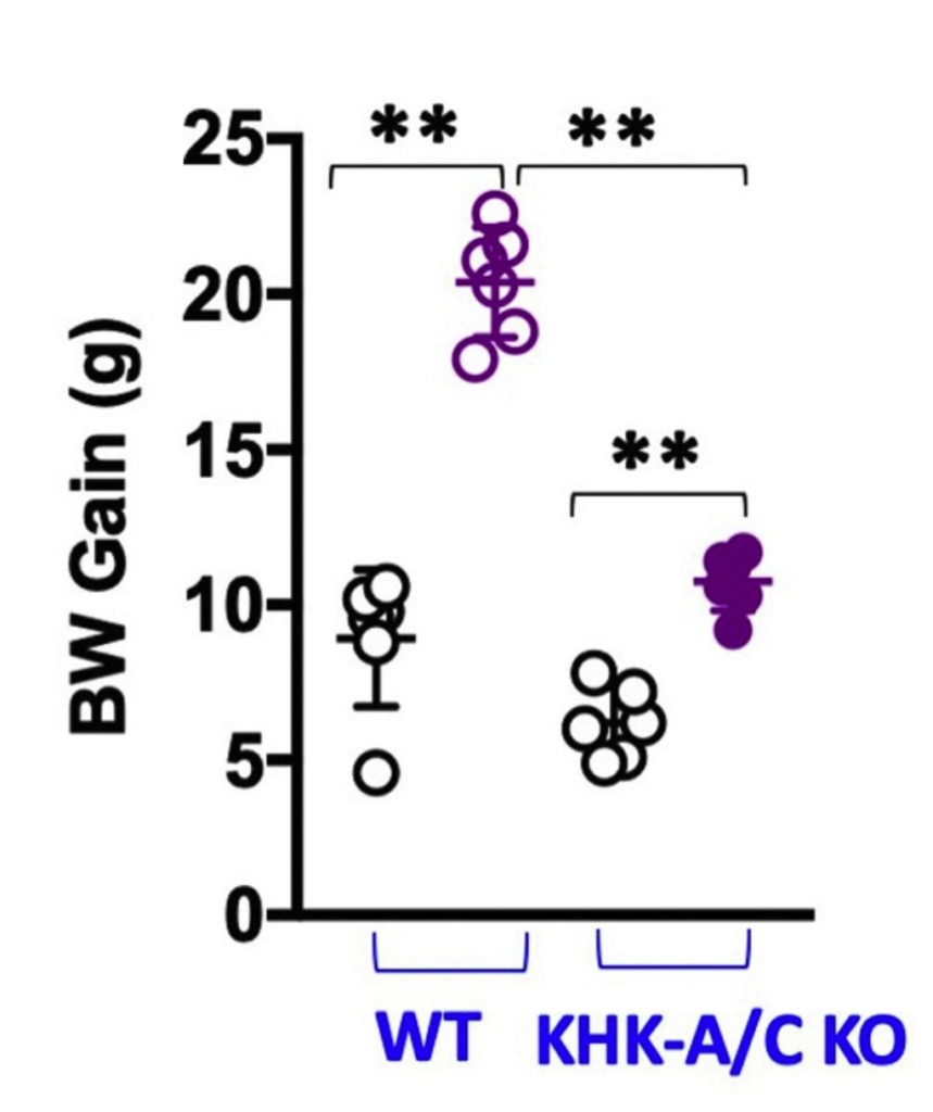 Normal wild type mice that drink glucose water have greater fat accumulation and insulin concentrations in the blood, indicative of insulin resistance. These effects are markedly inhibited when fructose metabolism is blocked in the KHK-A/C knockout mice.