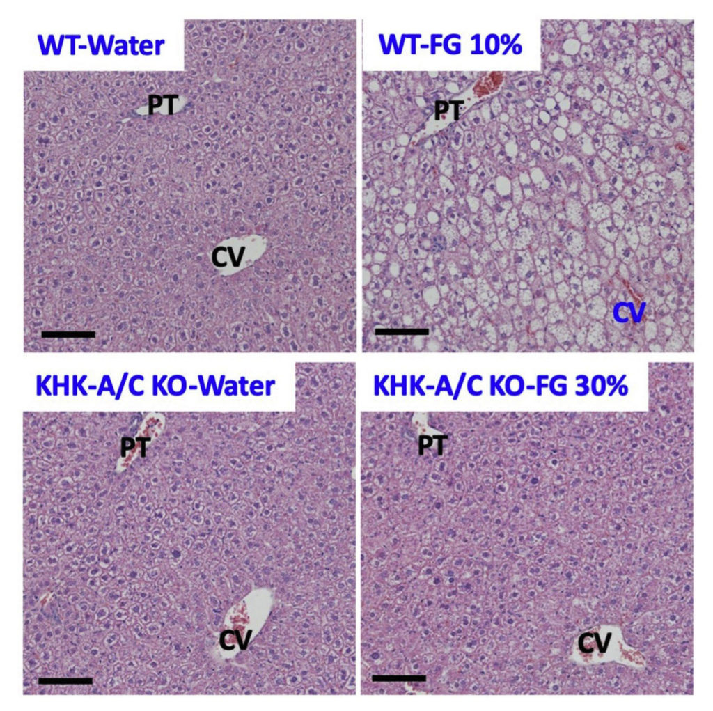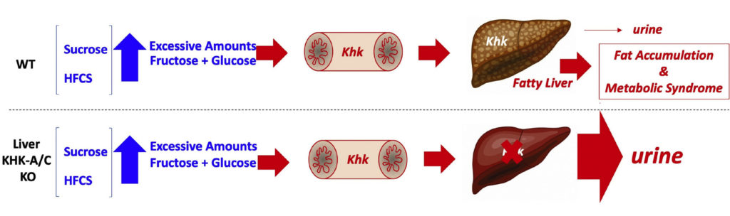 Excessive amounts of sugar (fructose and glucose) induce fatty liver and metabolic syndrome in normal WT mice by inducing greater sugar intake thus leading to increased fructose metabolism via KHK. The absence of KHK in the liver completely prevents fructose metabolism, leading to its excretion into the urine.
