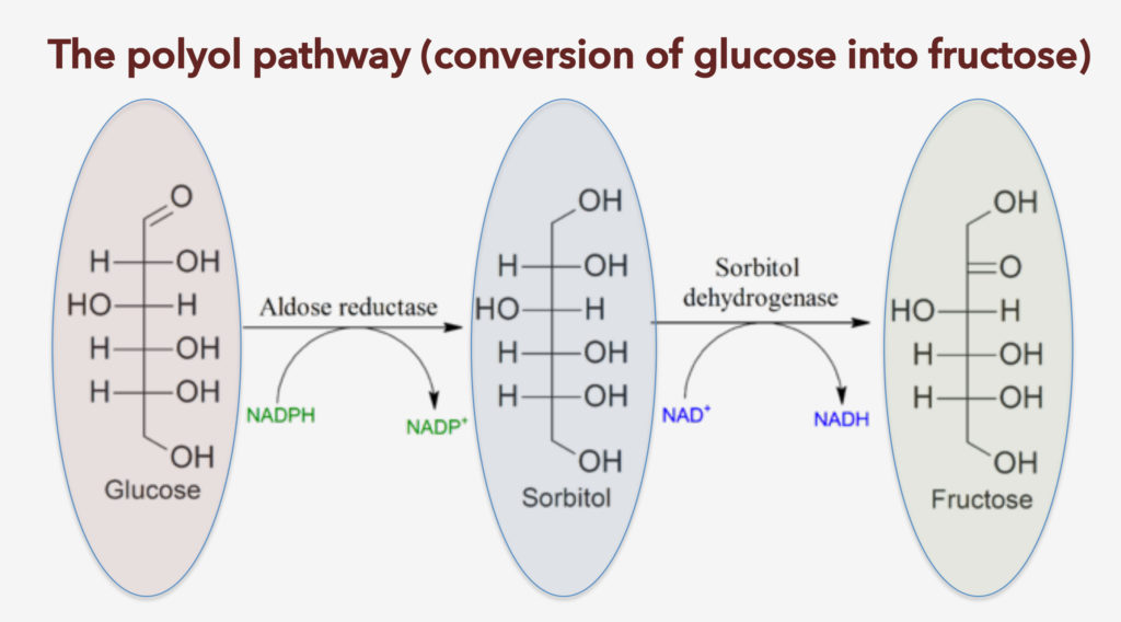In the polyol pathway, glucose is converted to fructose via two enzymes, aldolase reductase and sorbitol dehydrogenase. Interestingly, glucose was found to actually increase aldolase reductase (but not sorbitol dehydrogenase) activity, thus promoting its conversion to fructose.