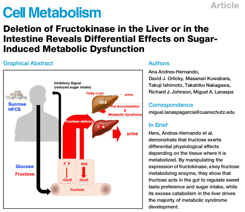 In one of the papers published by Andres-Hernando et al. in Cell Metabolism in July this year, the authors looked at the role that fructose has on the sugar-induced metabolic syndrome. The metabolic syndrome comprises of a set of symptoms (central obesity, elevated fasting blood glucose concentrations, high blood pressure, elevated blood triglyceride concentrations, elevated blood cholesterol levels), and sugar increases all of them. The paper has a number of interesting findings: