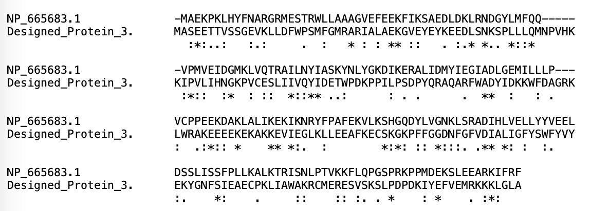 Therefore, overall, the overall bioinformatic evaluation of the design 3 sequence produced by Pinal suggests that the predicted protein is not only likely to function as a glutathione binding protein, but that it is also a highly novel protein that markedly differs from known proteins that carry out a similar function.