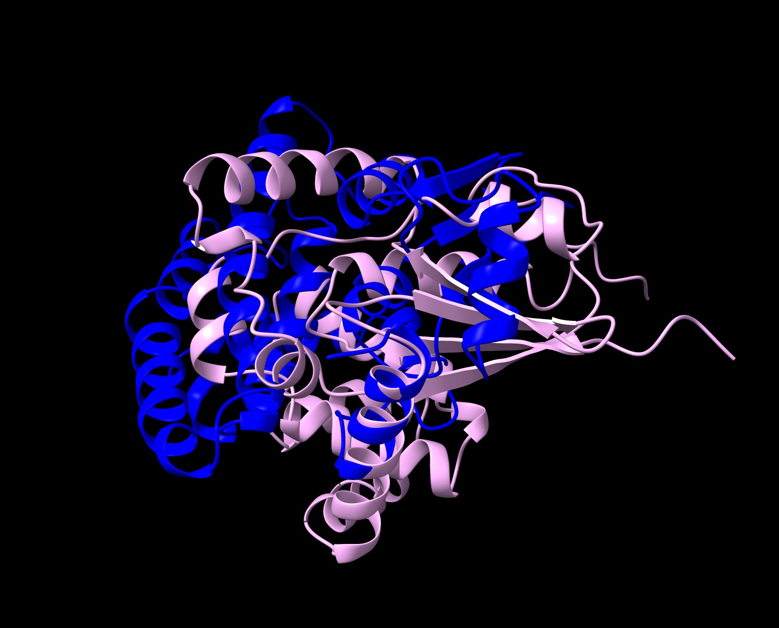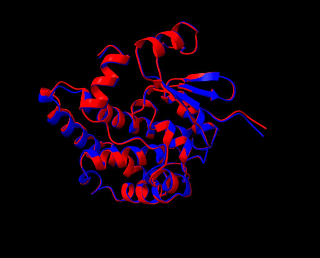 Comparison of the human glutathione S-transferase A1 predicted structure (red) and that of Pinal protein design 1 (blue) (using ChimeraX Matchmaker)