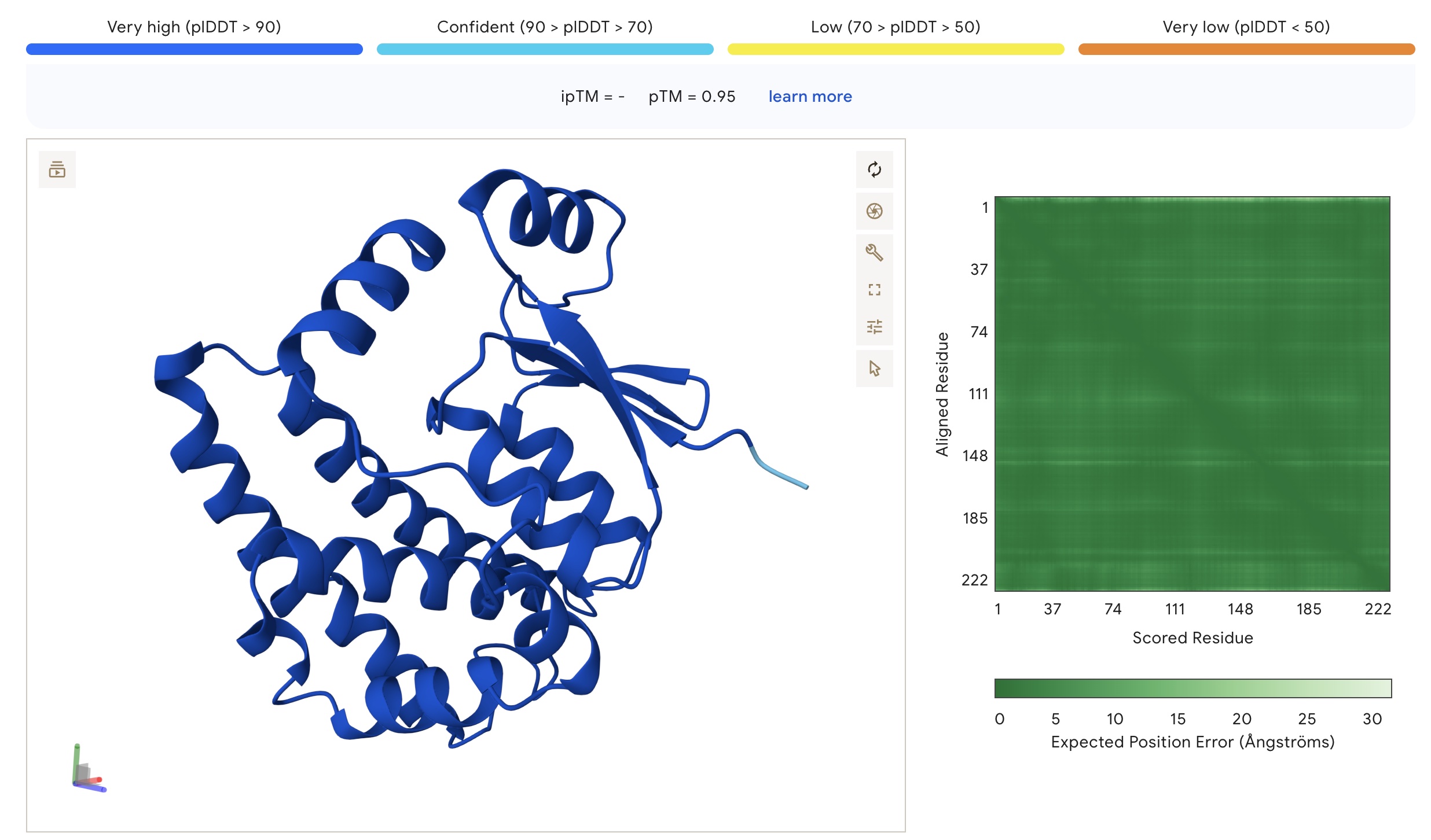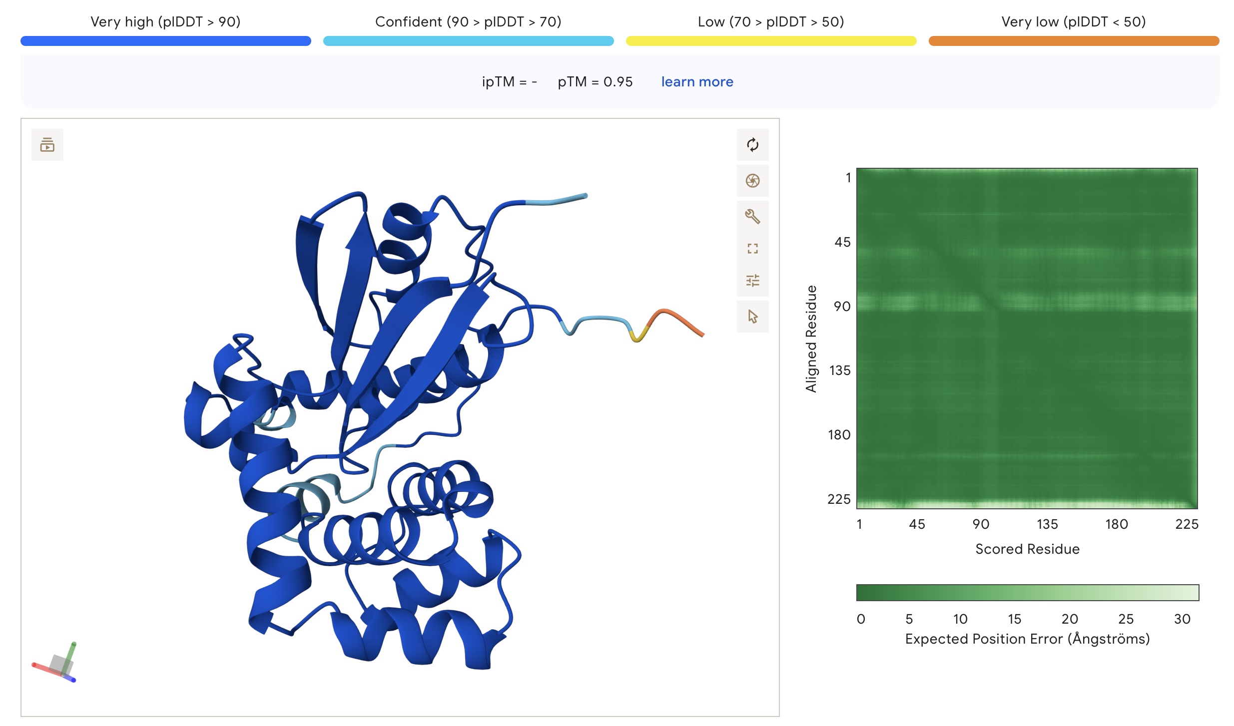 Secondly, there is the predicted aligned error (PAE). PAE estimates the distance error for every pair of residues. Thus, the PAE provides information about the relative accuracy between all pairs of residues. This is useful for measuring confidence in the relative positions of different protein regions. PAE is shown as a heatmap with amino acid numbers on both axes, where the colour indicates the predicted aligned error between a specific pair of amino acids. PAE values range from 0 – 35 Angstroms. According to Dai et al. (2024), PAE below 10 are commonly used thresholds indicating high prediction confidence.