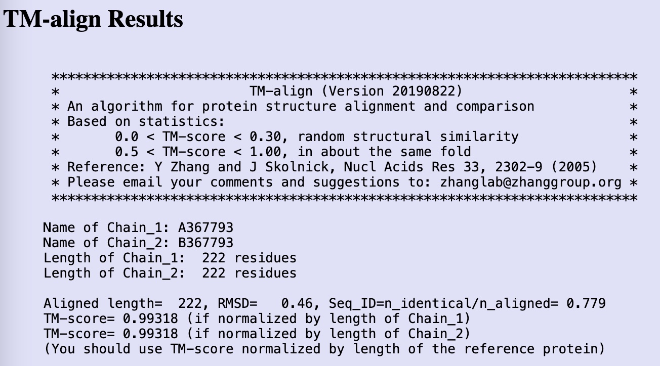 The TM score approach was developed as early as 2004 by Zhang and Skolnick. They defined the TM score, which stands for template modeling score, as an “an algorithm for protein structure alignment and comparison”.
