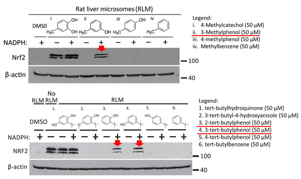 Specifically, as shown in the figure below, Mei Ying found that three compounds, 3-methylphenol, 2-tert-butylphenol and 3-tert-butylphenol, induced the expression of NRF2 after preincubation with rat liver microsomes (i.e. liver endoplasmic reticulum particles that contain CYP450 enzymes). These compounds were inactive without prior activation (not shown in the figure). Moreover, the prodrugs were only activated when the CYP450 co-substrate NADPH was added during the preincubation with liver microsomes.