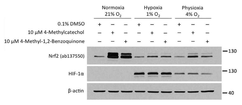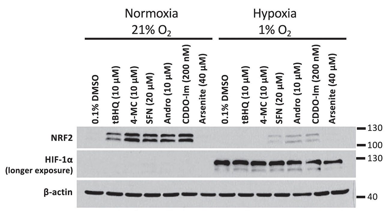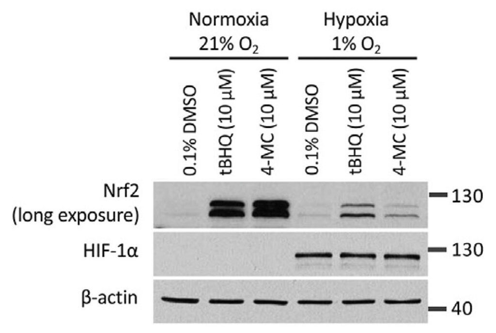 In the experiment, HEK293T cells were treated with 4-MC and tBHQ for 4 hours under normoxic (21% O2) or hypoxic (1% O2) conditions and the abundance of NRF2 was determined by Western blotting. The abundance of HIF-1α protein levels was measured as a control for the induction of hypoxia.